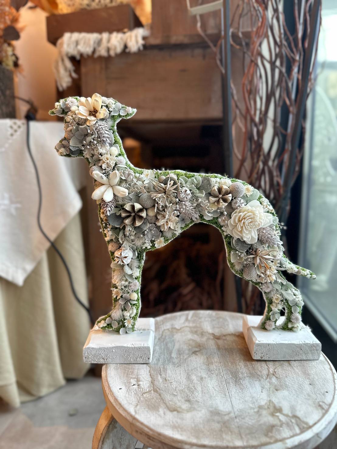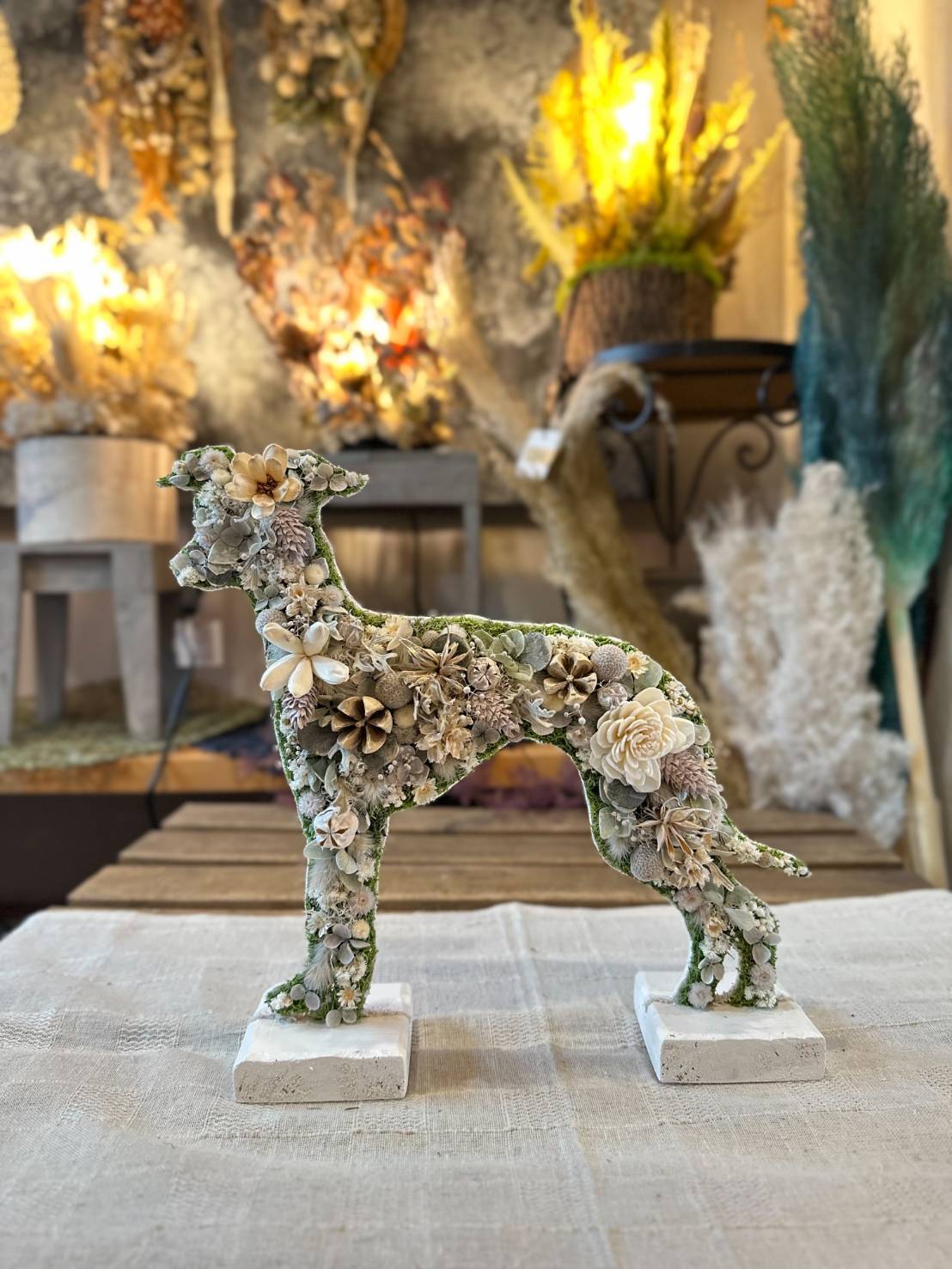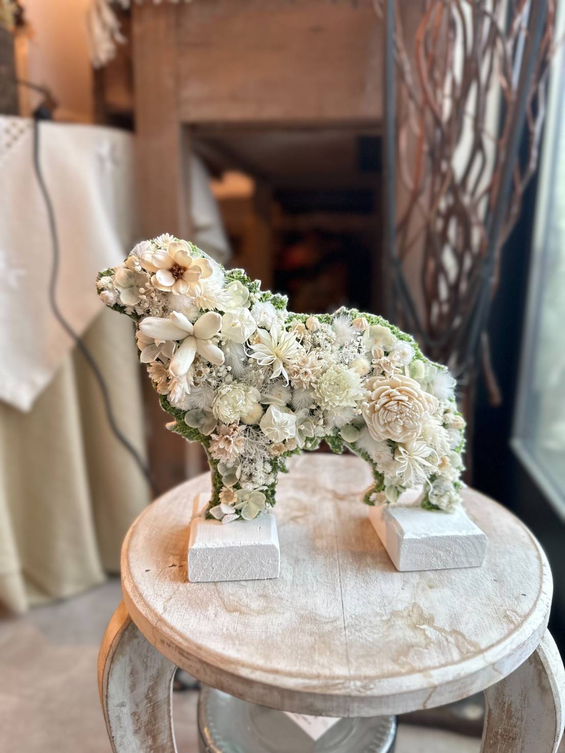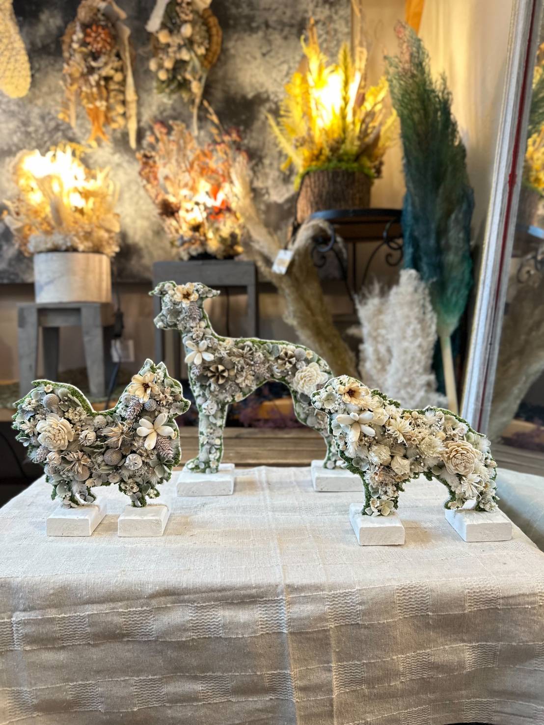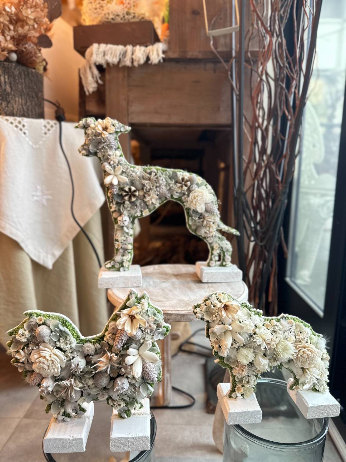 dry flowerで作ったポメラニアン、グレートピレニーズ、イタリアングレーハウンドの置き物になります.