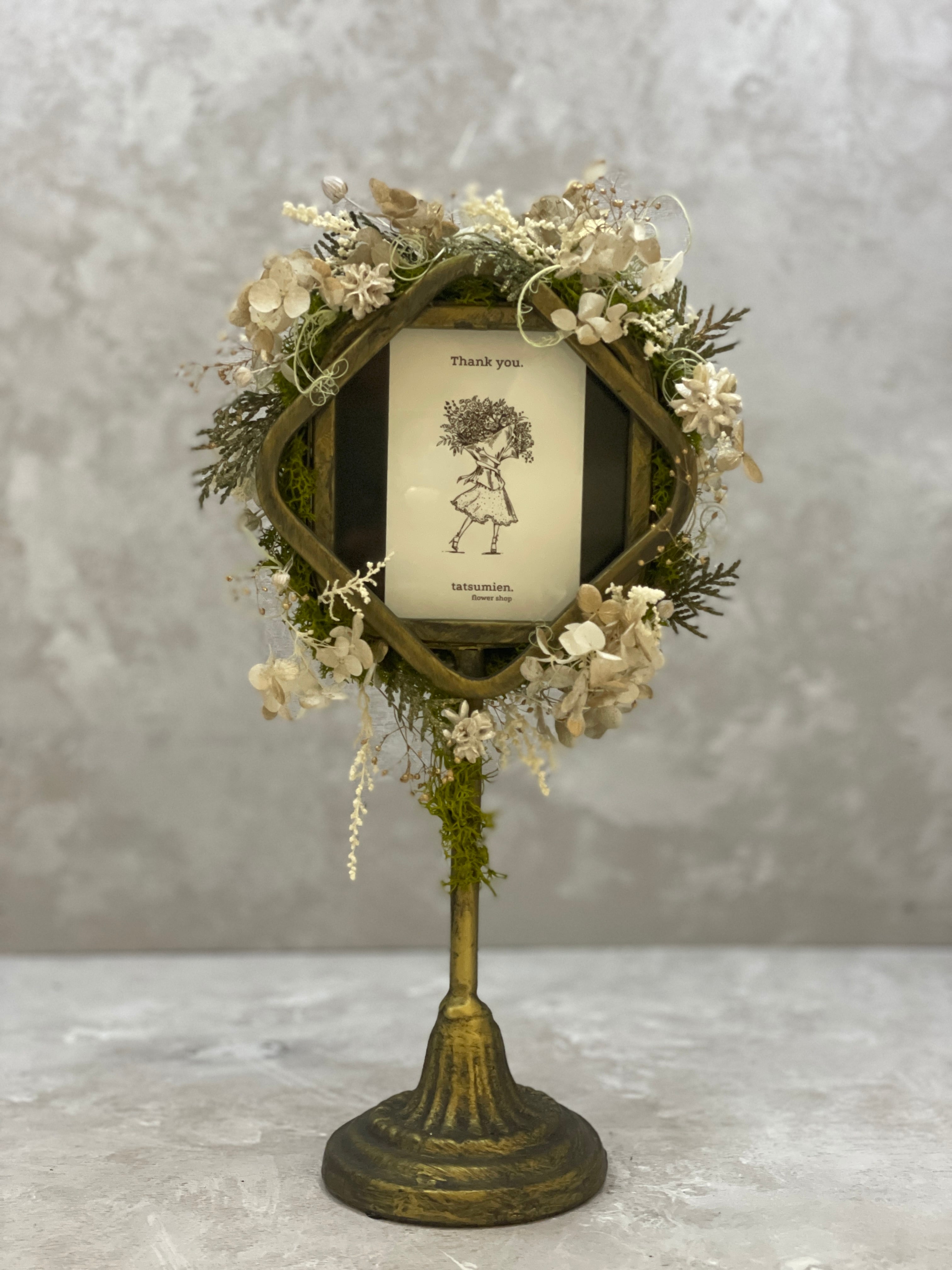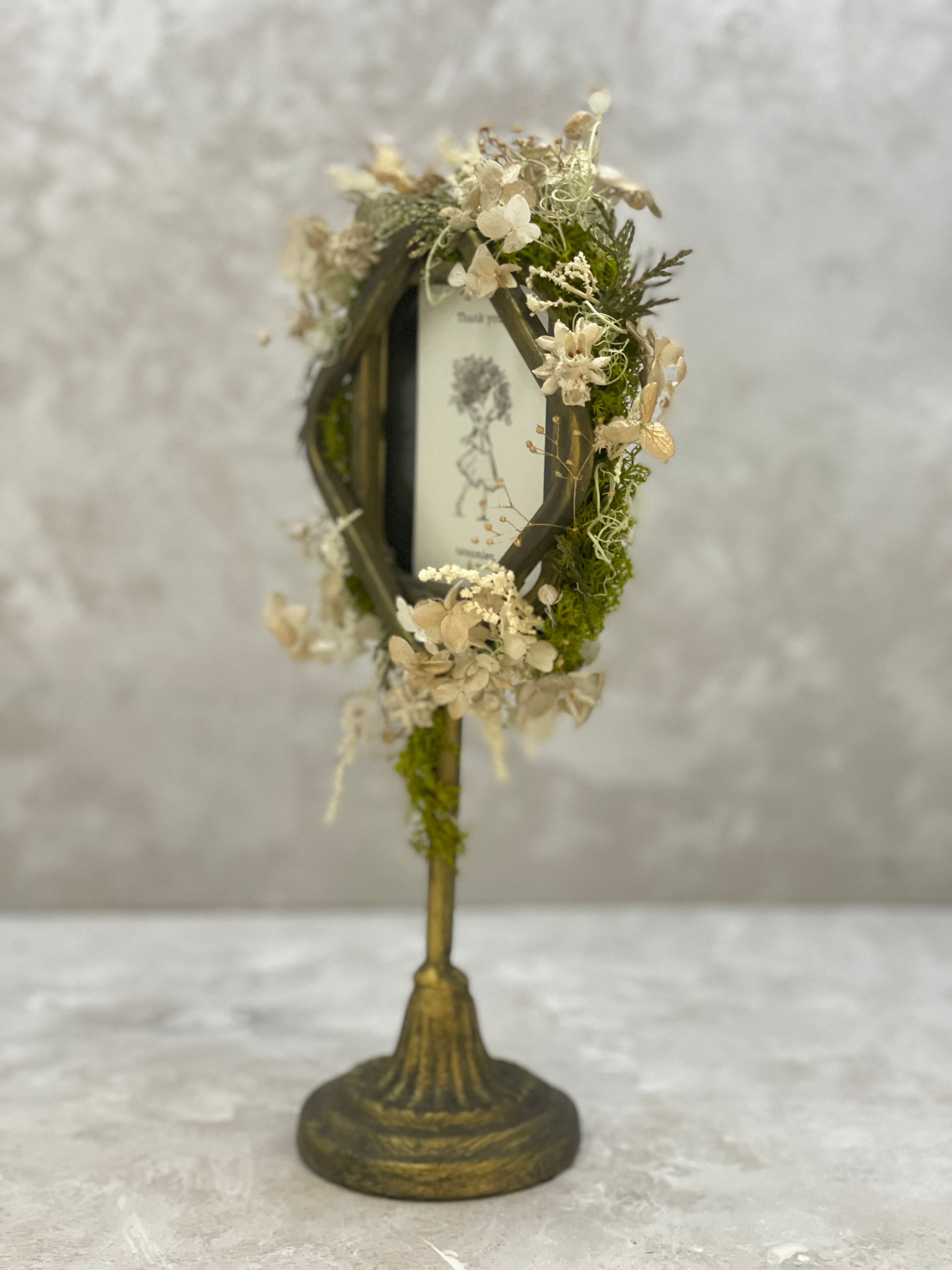 誕生日はもちろん、結婚のお祝いや記念日、出産祝いの贈り物にピッタリなドライフラワーで作ったアイアンフォトスタンドです.