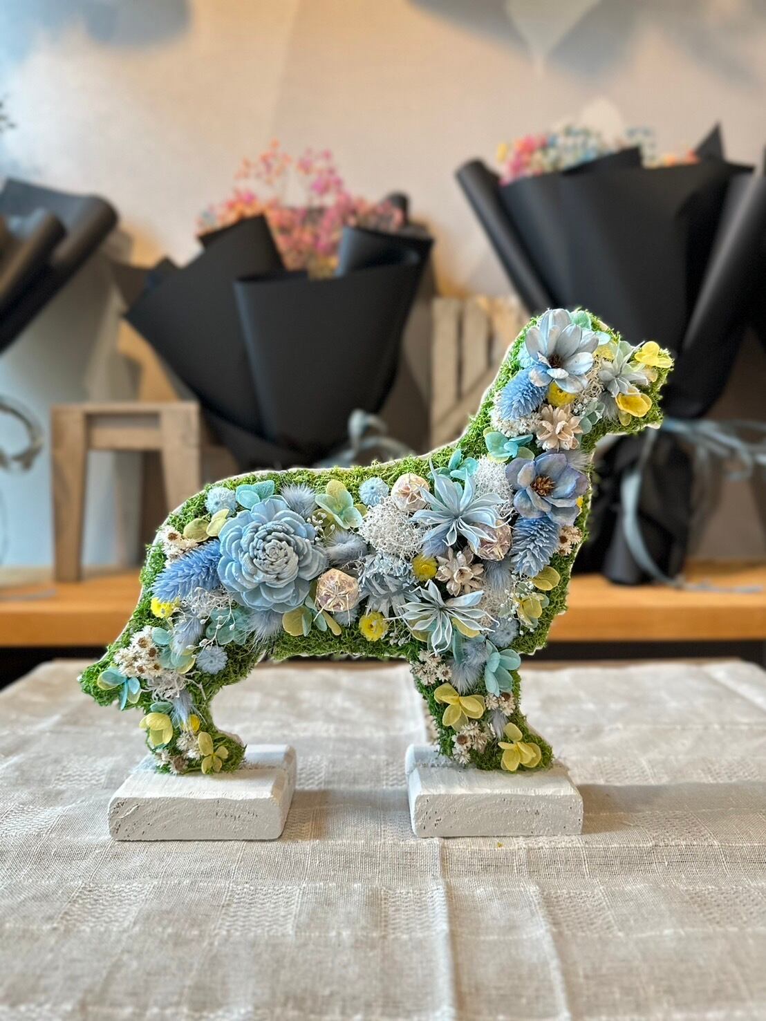 dry flowerで作ったゴールデンレトリバー、ハリネズミ、キンカチョウの置き物になります.